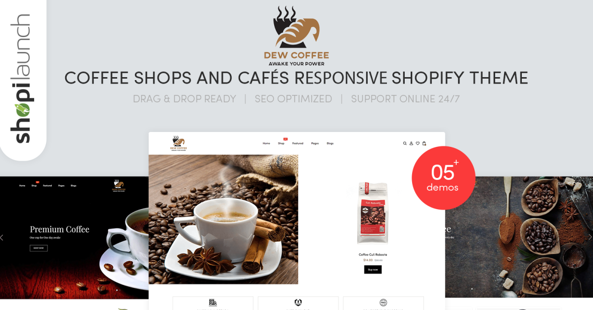 Mais do que apenas um varejista on-line, o DewCoffee não foi apenas projetado para exibir seus produtos com um lindo controle deslizante de imagem na região do cabeçalho.