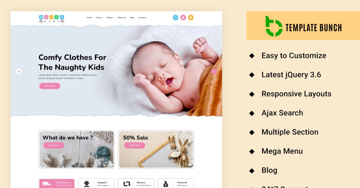 Com suporte 24 horas por dia, 7 dias por semana, o Magic - Baby Clothes Responsive Shopify Theme for eCommerce Website Template é a solução definitiva para criar uma loja de roupas para bebês profissional, elegante e fácil de usar.