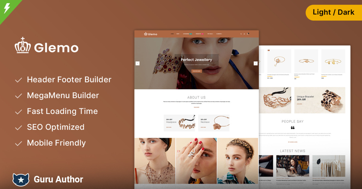 Glemo é um tema WordPress moderno e flexível com uma bela tipografia, transições sutis e navegação interessante. O tema Glemo foi criado especialmente para lojas de joias, moda, acessórios e artigos femininos. O tema Glemo foi projetado para tornar seu site mais bonito e sua vida mais fácil. O Glemo é compatível com um pacote de plugins premium, como o WPBakery Page Builder. Além disso, este plugin facilita a edição com o construtor de páginas de arrastar e soltar, ajudando você a criar qualquer layout de forma rápida e fácil. O tema Glemo inclui todos os recursos do tema, além de uma coleção de códigos de acesso e widgets poderosos, para fácil uso e capacidade. O tema Glemo vem com uma grande coleção de layouts de loja, incluindo diversos modelos e elementos de produtos.