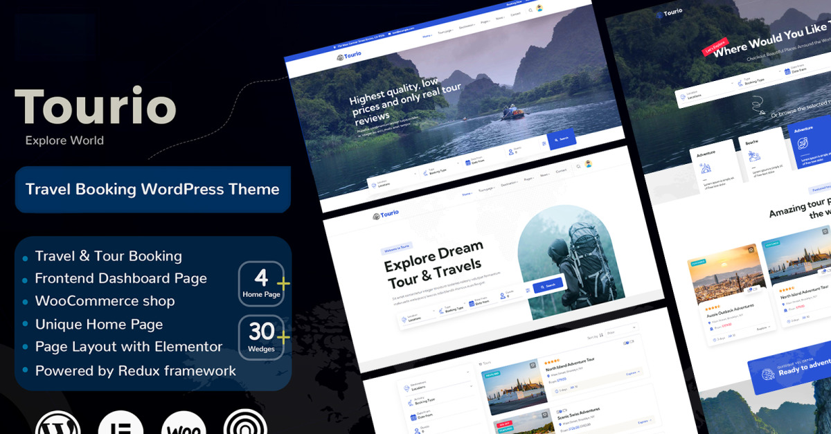 O tema Tourio é um modelo de turismo do WordPress e uma opção adequada para criar um site focado em vender serviços de turismo, passeios, ingressos, hotéis e criar sites de agências de viagens. Este tema é compatível com o poderoso construtor de páginas Elementor, permitindo que você crie layouts de página personalizados arrastando e soltando como quiser. O tema vem com quatro variações diferentes de homepage, e você pode escolher entre várias páginas.