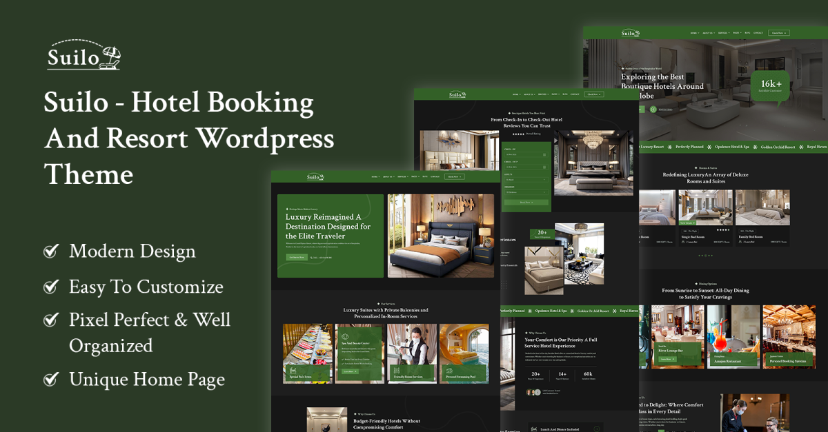 Suilo é um tema WordPress premium desenvolvido exclusivamente para hotéis, resorts, vilas, pousadas e empresas de hospitalidade que buscam se destacar com elegância e funcionalidade. Combinando estética deslumbrante com uma experiência de reserva fluida, o Suilo ajuda você a criar uma presença online luxuosa que reflete a verdadeira essência da sua marca.