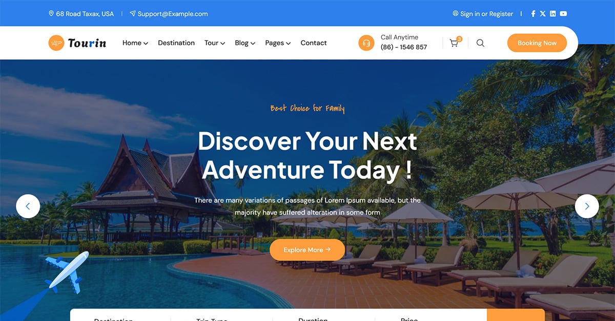 Transforme seu negócio de viagens com o tema WordPress Tourin Travel Booking – a solução completa para viagens, projetada para agências de viagens modernas e entusiastas. Desenvolvido com Elementor , este tema permite que você crie um site incrível e intuitivo sem precisar de conhecimento de programação.
