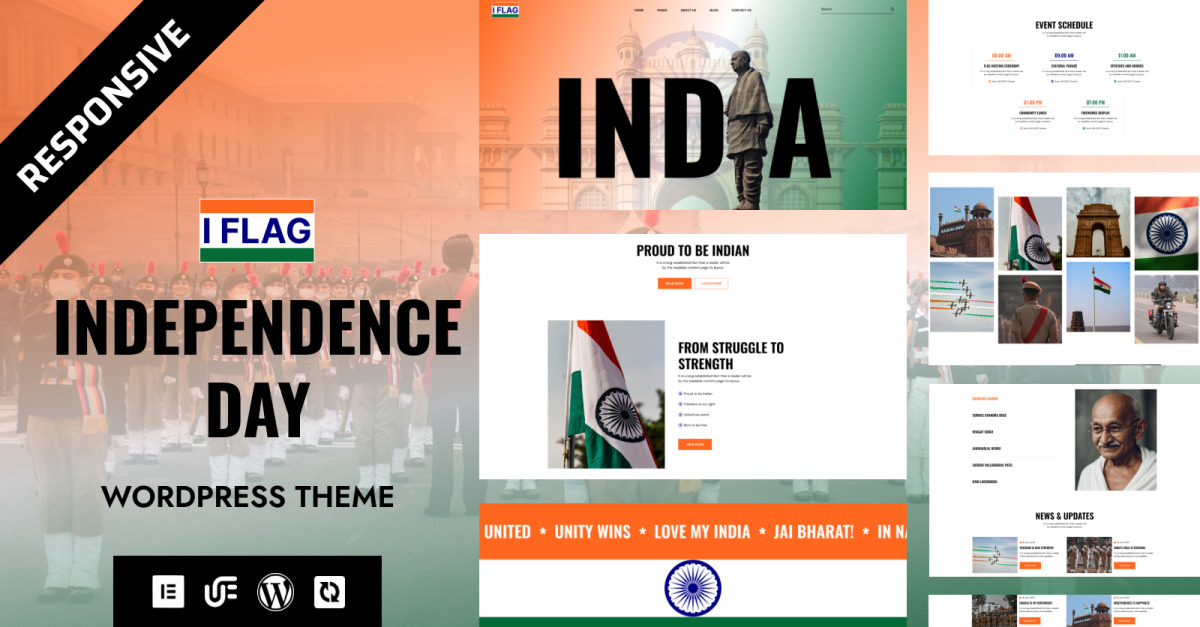 Quer você esteja criando um site para o Dia da Independência da I Flag (Índia – 15 de agosto, EUA – 4 de julho, ou qualquer outra celebração nacional), este tema oferece a flexibilidade para se adaptar às cores, símbolos e tradições do seu país. Também inclui layouts de blog para compartilhar conteúdo histórico, histórias de heróis nacionais ou reflexões patrióticas pessoais.
