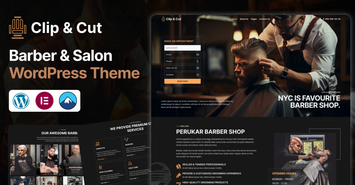 Clip & Cut – O tema WordPress Elementor para barbearias e salões de beleza é uma solução premium, elegante e de alto desempenho, projetada exclusivamente para barbeiros modernos, cabeleireiros profissionais e salões de beleza. Em vez de usar layouts genéricos, este tema é criado com precisão para refletir a vibrante cultura dos setores de beleza, moda e cuidados pessoais.