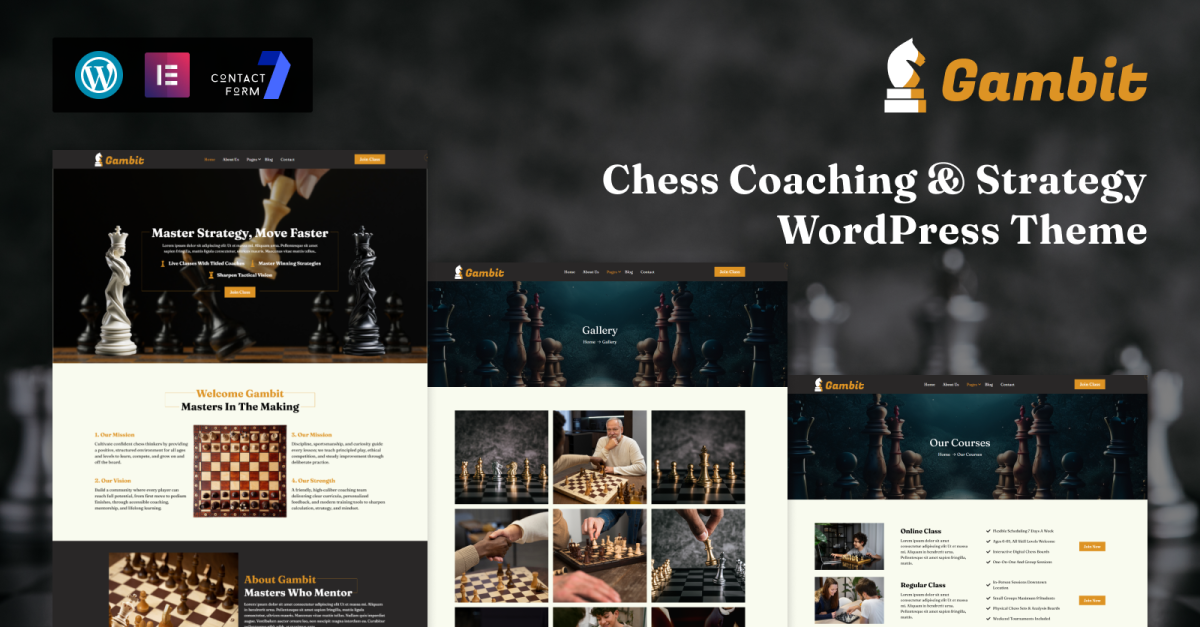 Gambit é um tema WordPress moderno e elegante para treinamento de xadrez, criado para academias de xadrez, instrutores, clubes e centros de aprendizagem online. Com um design refinado e layout estratégico, o Gambit ajuda você a apresentar suas aulas, mentores e histórias de sucesso da maneira mais profissional possível.