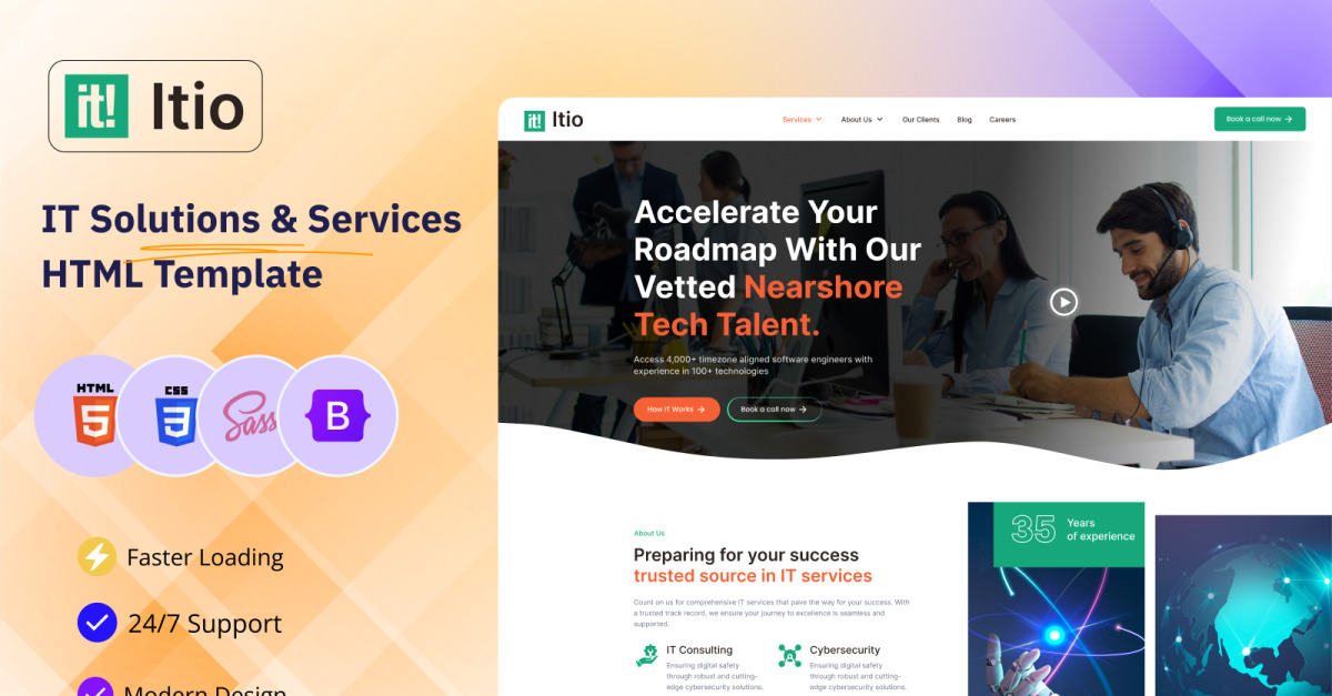 ITio é um modelo HTML de última geração projetado para capacitar empresas de TI e provedores de serviços a mostrarem seus conhecimentos e ofertas. Com um design elegante e moderno, o ITio oferece uma infinidade de recursos e integrações para ajudar seu negócio de TI a brilhar online. Este modelo vem equipado com uma variedade de tecnologias e ferramentas para aprimorar a experiência do usuário.