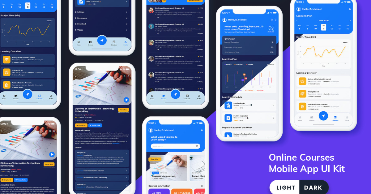 Kit de IU de aplicativo móvel de cursos on-line (claro e escuro)