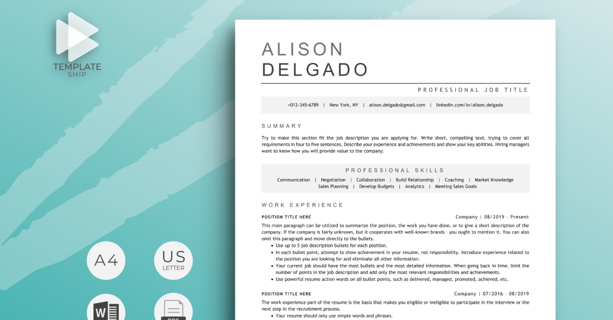 - 1 and 2 pages resume template optimized for Word and Google Docs (US Letter and A4 sizes)
