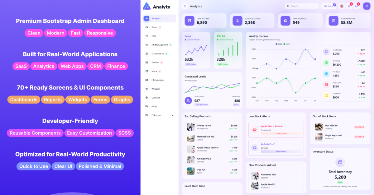 Analytx — это передовой шаблон панели администратора, созданный на Bootstrap и предназначенный для поддержки приложений, работающих с большими объёмами данных, благодаря продуманному и интуитивно понятному интерфейсу. Он сочетает в себе лаконичную эстетику и модульную структуру, что делает его идеальным для аналитических платформ, панелей SaaS, систем бизнес-аналитики, инструментов отчётности и корпоративных решений. Analytx делает акцент на ясности и производительности, предлагая прекрасно организованные макеты, динамические визуализации и интерактивные компоненты, которые помогают командам опережать ключевые показатели эффективности (KPI), контролировать производительность системы и легко находить ценную информацию.