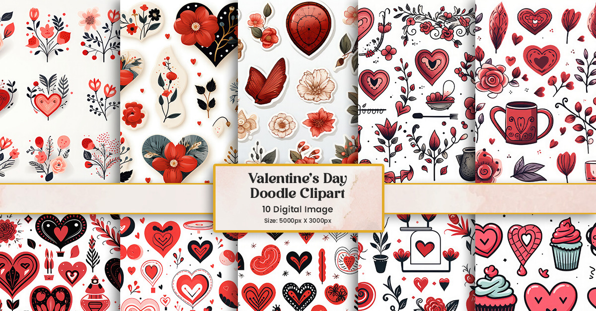 Набор каракулей ко Дню святого Валентина, клипарт наклейки с сердечками, цветочные элементы украшения фона 14 $ Download