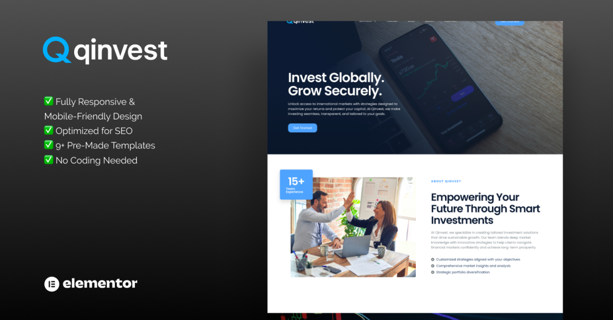 Qinvest — шаблон Elementor для инвестиционных и финансовых консалтинговых компаний
