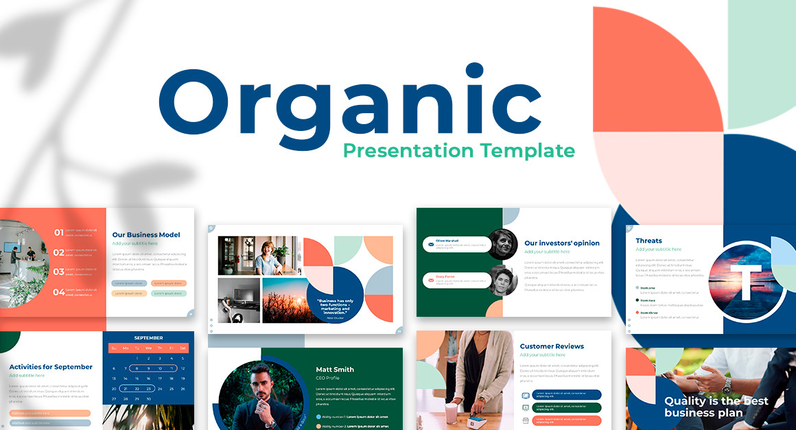 Органическая презентация Google Slides отмечает новую тенденцию: сочетание цветов и форм с идеальным сочетанием, чтобы привлечь внимание ваших клиентов и сохранить интерес к следующему слайду. Вам нужно только заменить свой собственный текст, изображения включены, но если вы хотите использовать свои собственные изображения, в этом шаблоне есть функция легкого перетаскивания! Если вас впечатлил этот шаблон, ваша очередь произвести впечатление на свою аудиторию!