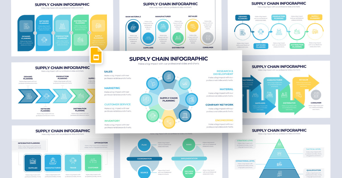 Инфографика цепочки поставок Шаблон Google Slides Плоский, чистый, минималистичный, элегантный и гибкий шаблон презентации.