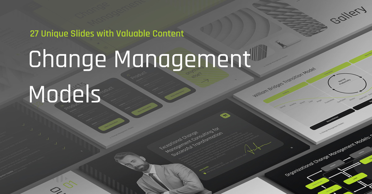 27 уникальных слайдов с ценным содержанием: «Понимание моделей управления изменениями», «Выбор идеальной модели управления изменениями: пошаговое руководство», «12-шаговый процесс выбора оптимальной модели управления изменениями», «Краткий подход к выбору эффективной модели управления изменениями». , Различные модели и теории управления изменениями, Трансформация бизнеса и управление изменениями, Модель трех стадий изменений Левина (размораживание, изменение и повторное замораживание), Модель перехода Уильяма Бриджеса, Метод бизнес-изменения CHAMPS2, Модели управления организационными изменениями: сдвиги и дрейфовые изменения, Берк - Модель изменений Литвина, Дорожная карта вирусных изменений, 8-ступенчатая модель изменений Коттера, Наша команда (2 шаблона), Продукт (шаблон), Таблицы цен (шаблон), Галерея (3 шаблона), Проект (шаблон), Отзыв (2 шаблона) , Контакт (Шаблон).