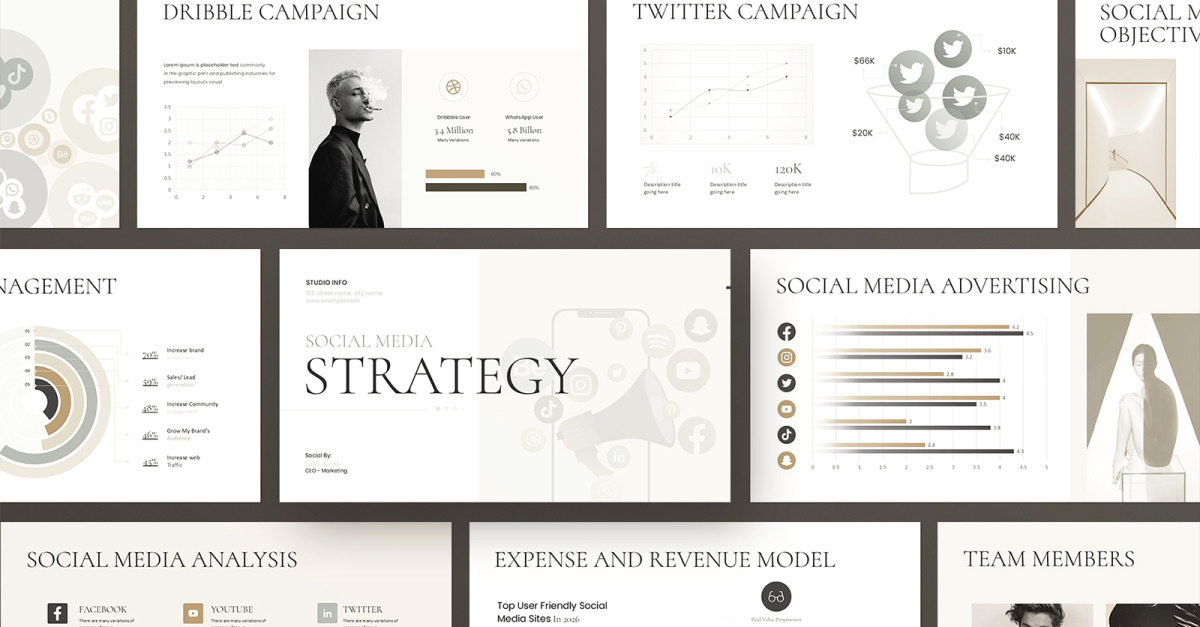 Этот шаблон Google Slides для стратегии в социальных сетях содержит более 115 полезных слайдов для стратегий и процессов в социальных сетях, таких как анализ пользователей, анализ рынка, таргетинг, план социальных сетей, маркетинговая стратегия, контент-план, кампания, расписание, маркетинговые ключевые показатели эффективности, бюджет и многое другое.
