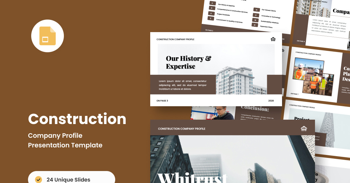 Профессиональная и отточенная презентация Google Slides для строительных фирм, архитектурных агентств и разработчиков. Разработанный в современной индустриальной эстетике, этот шаблон представляет экспертизу компании, проекты и услуги в увлекательной манере.