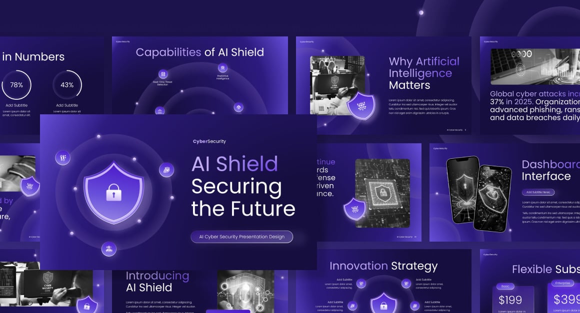 Защитите своё цифровое будущее с помощью этого шаблона презентации по кибербезопасности с использованием искусственного интеллекта, включающего светящиеся неоновые градиенты, значки защиты в виде щитов и узлы данных разведки. Каждый слайд чётко структурирован, чтобы ваш контент выглядел чётко, убедительно и визуально привлекательно.