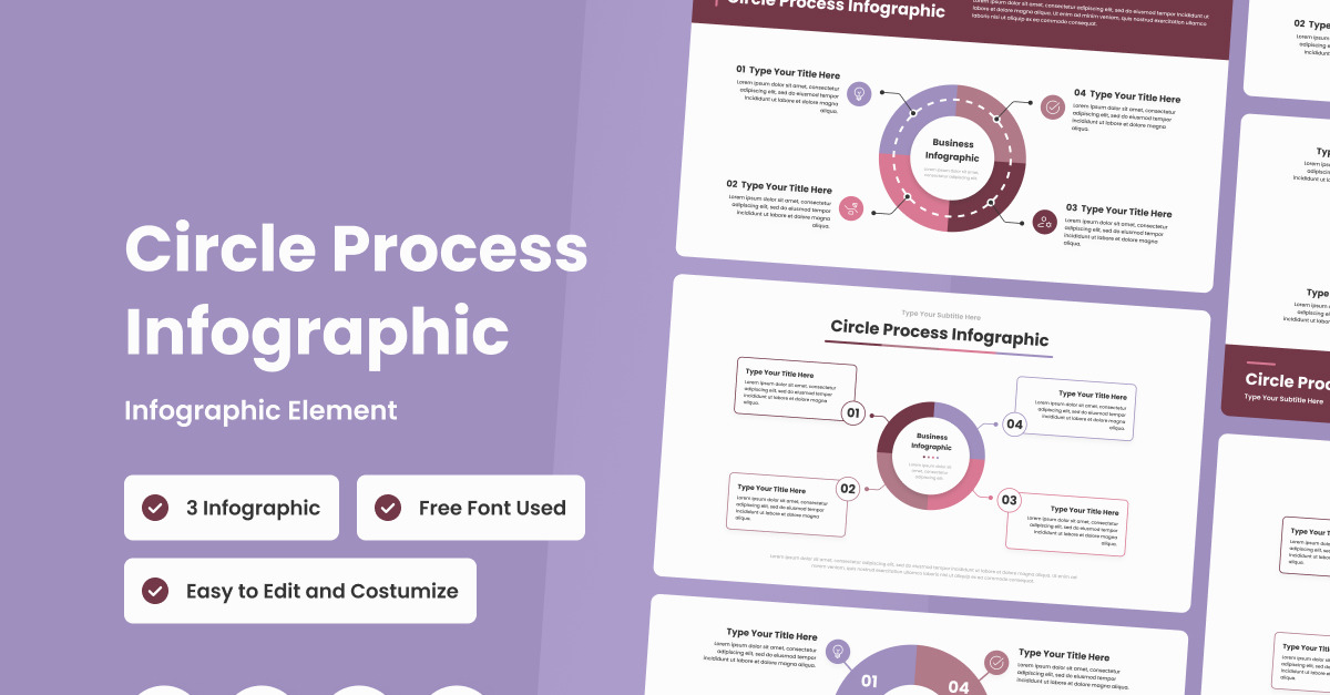 Динамически визуализируйте свои идеи с помощью инфографического шаблона Circle Process. Привлекайте аудиторию и упрощайте сложные концепции с помощью элегантной круговой графики. Независимо от того, представляете ли вы рабочие процессы или этапы проекта, этот шаблон предлагает универсальность и сложность, превращая ваши данные в впечатляющие визуальные повествования.