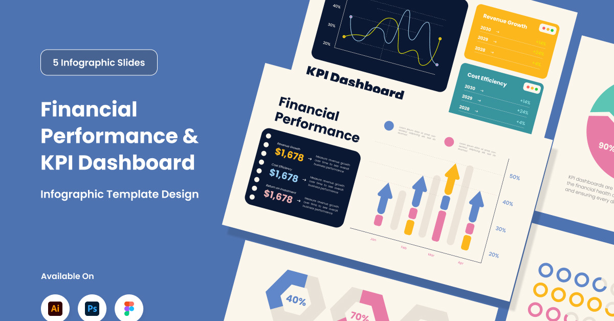 Отслеживайте и визуализируйте ключевые показатели эффективности с помощью этого инфографического дизайна. Созданный с учетом финансовой ясности, макет является чистым, редактируемым и адаптируемым для различных потребностей в отчетности.
