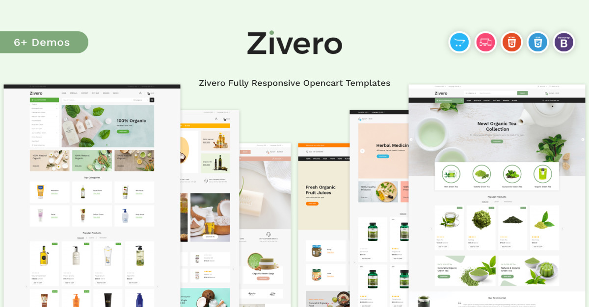 Zivero — это современный, стильный и полностью адаптивный шаблон OpenCart, который станет лучшим решением для вашего интернет-магазина товаров для здоровья, органики, косметики, мыла, органического масла, натурального, чая, зеленого чая, специй, лекарств, продуктов питания, органических лекарств, соков, красоты, товаров для здоровья, косметических средств, моющего средства, средств по уходу за кожей, натурального чая, одежды или любых многоцелевых магазинов. Шаблон OpenCart Zivero — Organic & Beauty выглядит великолепно и профессионально благодаря цветовой комбинации.