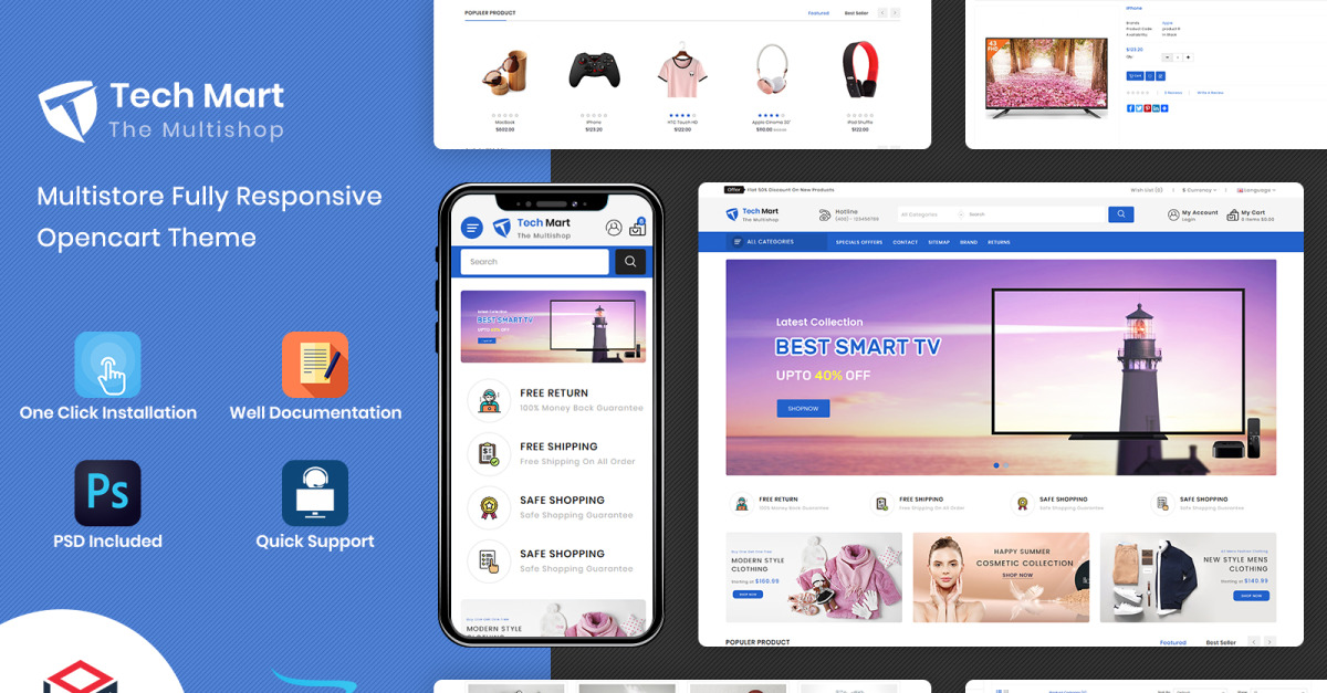Шаблон TechMart - Shopping Mall OpenCart - это простой и чистый макет с элегантным дизайном, его легко установить и использовать. Не требуется никаких знаний HTML, его легко установить и использовать. Он был создан с учетом мобильных пользователей. Поэтому он отлично смотрится на настольных компьютерах, планшетах и мобильных устройствах.7 TechMart - это потрясающая, надежная и гибкая тема с дизайном и всеми функциями онлайн-категории и полностью настраиваемая, подходящая для веб-сайта электронной коммерции. Он специально посвящен моде, керамике, цветам, обуви, зоомагазину.