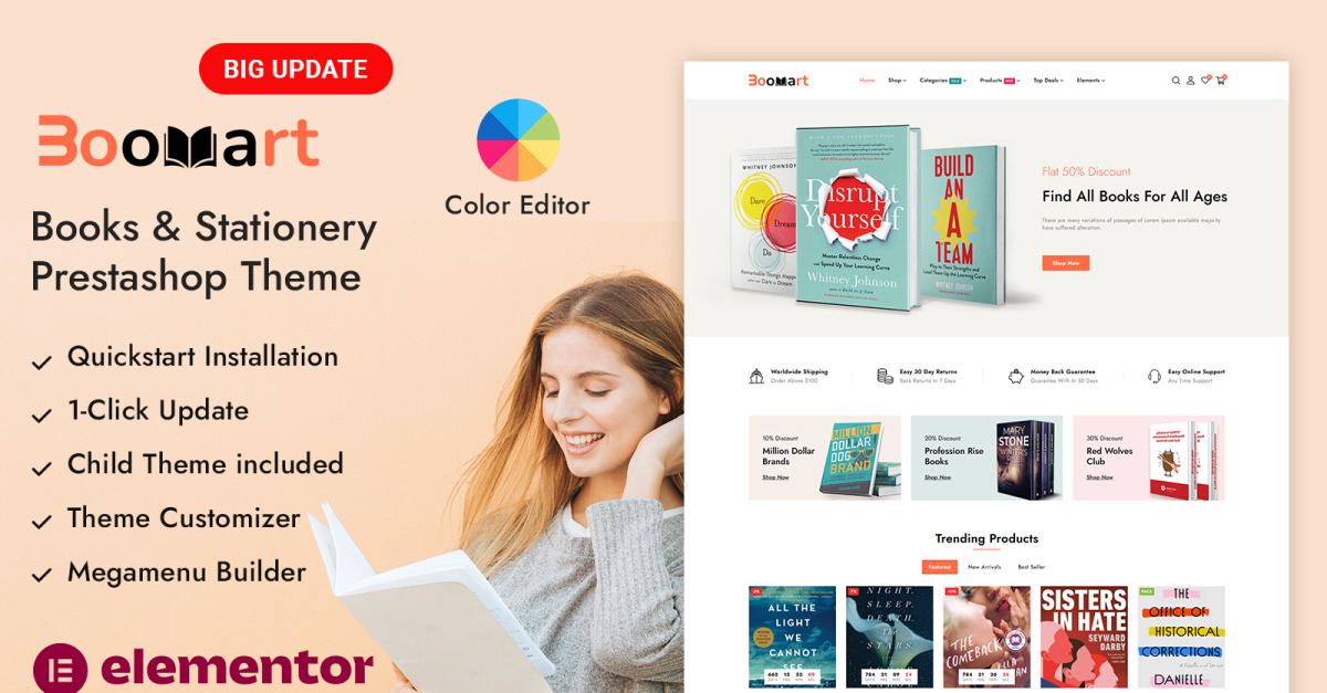Созданный с использованием интуитивно понятного конструктора страниц Elementor , Bookmart позволяет настраивать макеты главной страницы, сетки товаров, баннеры и рекламные разделы с помощью простых элементов управления перетаскиванием — без необходимости знания программирования. Встроенный модуль настройки темы предоставляет полную гибкость в настройке цветов, шрифтов и стилей макета в соответствии с индивидуальностью вашего бренда и атмосферой книжного магазина.