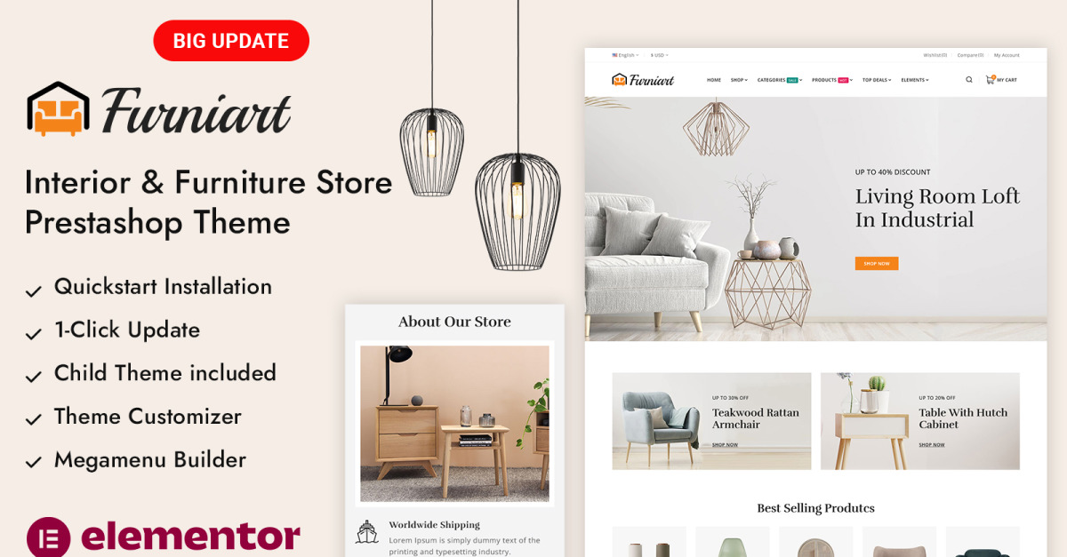 Furniart – адаптивная тема PrestaShop для магазинов товаров для дома и мебели – это современное, элегантное и многофункциональное решение для электронной коммерции, разработанное для мебельных салонов, бутиков товаров для дома, дизайнеров интерьеров, магазинов товаров для дома и брендов декора. Благодаря лаконичному дизайну, изысканной типографике и просторной компоновке, Furniart создает премиальный опыт покупок, который прекрасно подчеркивает коллекции мебели и предметов декора.