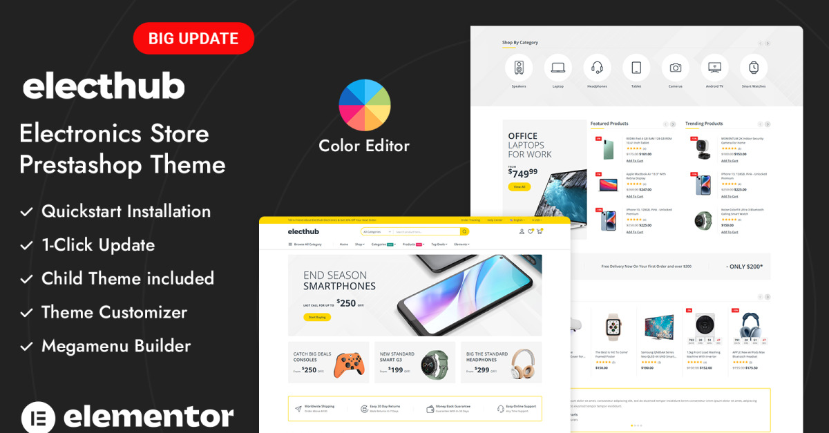 Electhub — это чистая, современная и легко адаптируемая адаптивная тема PrestaShop, разработанная для магазинов электроники, гаджетов, цифровых аксессуаров, бытовой техники и многоцелевых торговых площадок . Electhub отличается чётким и профессиональным визуальным стилем, предлагает структурированные макеты, сбалансированные интервалы и чёткую презентацию товаров, помогая вам представить широкий ассортимент технологичной продукции — от смартфонов, ноутбуков и камер до устройств для умного дома, аудиооборудования, игровых аксессуаров и многого другого.