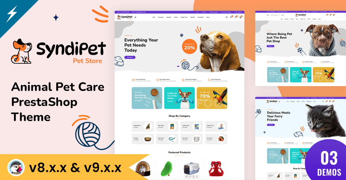 С нашей темой PrestaShop для животных и зоомагазинов Syndipet Animal & Pet Store вы можете войти в мир, наполненный счастливым мурлыканьем и маханием хвостами. Эта тема представляет собой цифровое убежище для любителей животных и их пушистых друзей, созданное, чтобы отправиться в путешествие по красочному зверинцу.