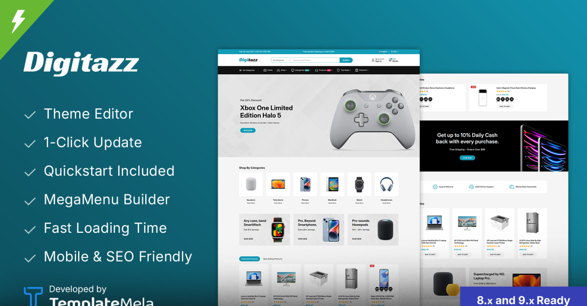 Помимо потрясающего дизайна и безупречной функциональности, Digitazz предлагает непревзойденную универсальность. Он идеально подходит для множества ниш, таких как шаблоны магазинов электроники, шаблоны компьютерных магазинов и даже веб-сайты торговых центров. Итак, независимо от того, являетесь ли вы индивидуальным предпринимателем или крупным ритейлером, наша тема удовлетворит все ваши конкретные потребности.