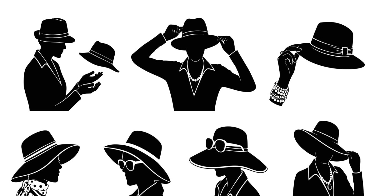 Восемь чёрных силуэтов людей в шляпах и аксессуарах, изолированных на белом фоне.