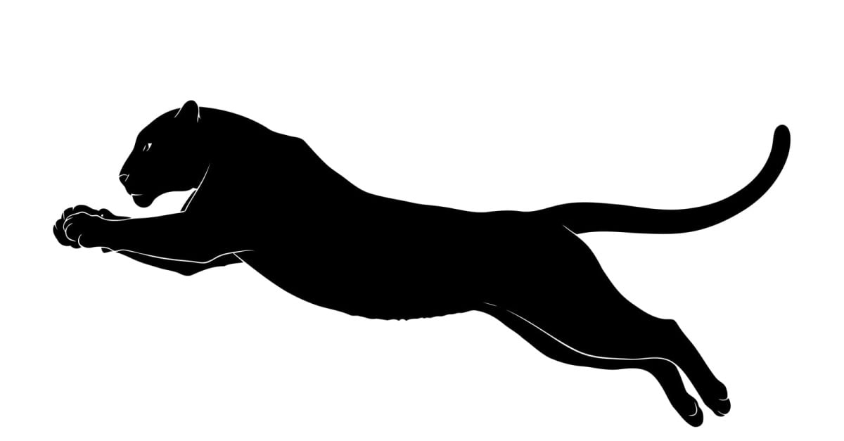 Динамичный силуэт черного гепарда, несущегося вперед, с детальной прорисовкой шерсти, на белом фоне. 9 $ Download