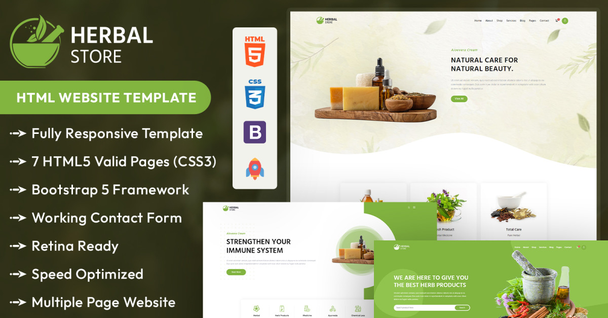 Семь действительных страниц HTML-шаблона Herbal Store помогут вашим клиентам узнать о вашем бизнесе и ингредиентах, а дополнительная функция — адаптивное поведение на любом экране.