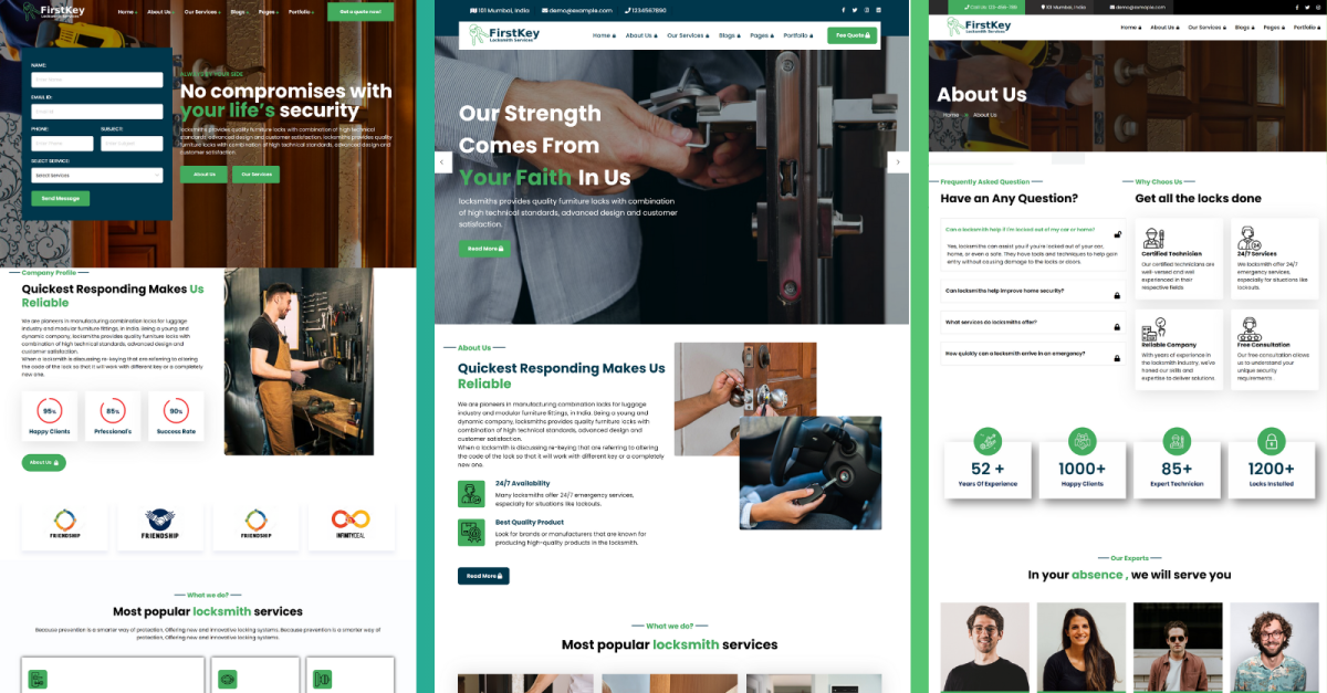 FirstKey — HTML-шаблон слесарной службы. FirstKey — это оптимизированный для SEO, отзывчивый, чистый, креативный и современный шаблон HTML5. FirstKey построен на последней версии Bootstrap v5.0.0 с помощью плагинов HTML5, CSS3, JavaScript и JQuery. Шаблон имеет анимацию jQuery, современные эффекты CSS и поддержку почты SMTP с PHP, Google, иконками Flaticon. Шаблон имеет 100% адаптивную поддержку кроссбраузерности, например, Chrome, Firefox, IE10+, Safari, Opera и т. д. Шаблон поставляется с аккуратным и чистым кодом, простым для понимания и снабжен документацией.