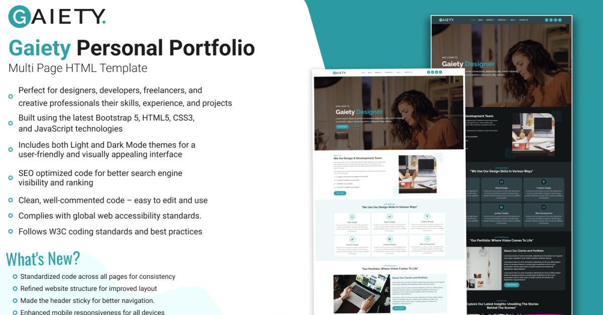 Gaiety — это современный, стильный и полнофункциональный многостраничный HTML5-шаблон сайта, разработанный для творческих профессионалов, фрилансеров, дизайнеров, разработчиков и агентств. Этот шаблон, созданный с использованием Bootstrap 5, HTML5, CSS3 и JavaScript, обладает полностью адаптивным дизайном с переключением светлой/тёмной темы, обеспечивая удобный просмотр на всех устройствах. Благодаря элегантному дизайну, продуманной типографике и тщательному вниманию к деталям, Gaiety позволит вам наглядно представить свои навыки, портфолио, услуги, блог и достижения. Каждый раздел призван подчеркнуть ваши работы, привлечь посетителей и произвести неизгладимое впечатление. Независимо от того, являетесь ли вы веб-дизайнером, фотографом, художником или фрилансером, Gaiety предлагает продуманную профессиональную платформу для продвижения вашего личного бренда в Интернете.