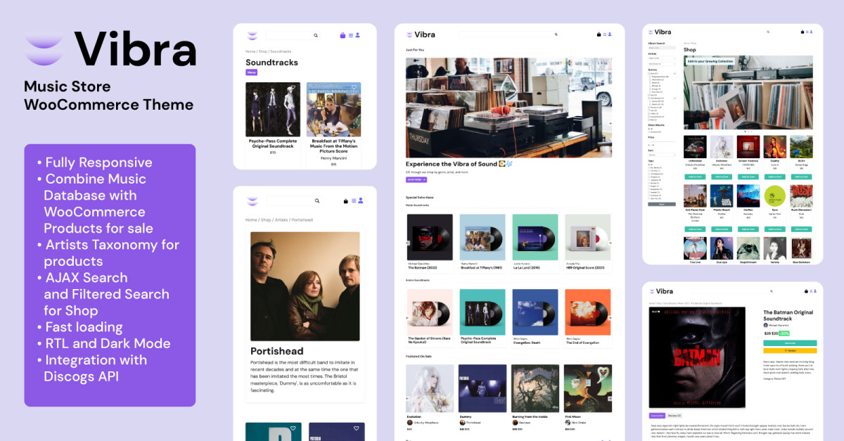 VIBRA включает в себя дополнительные интеграции для AJAX-поиска и фильтрованного поиска , обеспечивая пользователям молниеносный доступ к альбомам, исполнителям и жанрам. Независимо от того, управляете ли вы специализированным магазином виниловых пластинок или полномасштабной музыкальной торговой площадкой, эти инструменты делают навигацию интуитивно понятной и привлекательной.