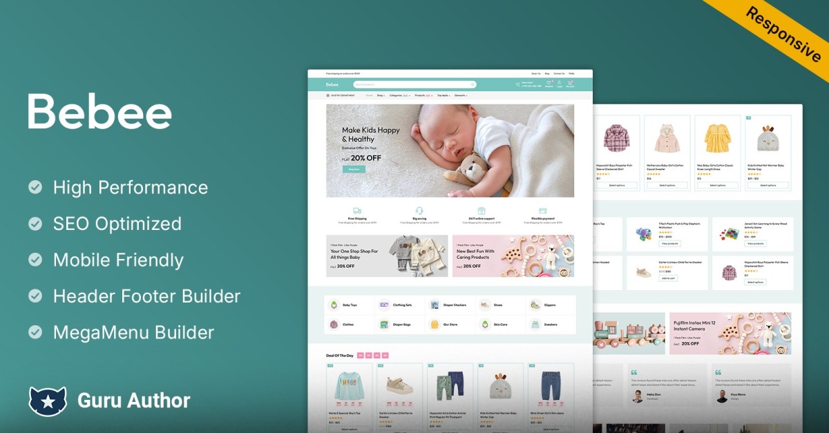 Bebee отличается мягким и игривым дизайном, который нравится родителям и опекунам, которые ищут лучшие товары для своих малышей. Его пастельная цветовая палитра, очаровательные значки и дружелюбные шрифты создают гостеприимную атмосферу, которая успокаивает клиентов. Благодаря множеству предварительно разработанных макетов домашней страницы вы можете легко выбрать тот, который лучше всего отражает уникальное очарование вашего бренда.