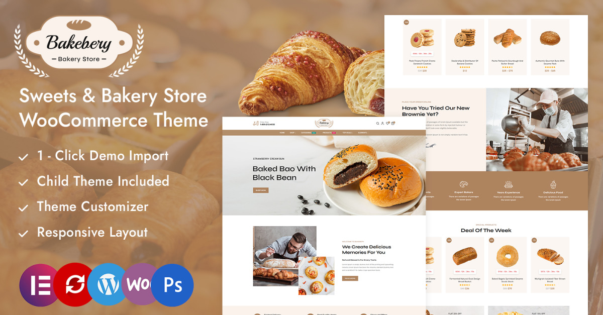 Bakebery — адаптивная тема Elementor WooCommerce для пекарни и кондитерской — это прекрасно продуманная тема WordPress, разработанная специально для пекарен, кондитерских, кафе и магазинов десертов. Bakebery, созданная с помощью мощного конструктора страниц Elementor, предлагает полностью настраиваемый и удобный дизайн, позволяющий создать привлекательный интернет-магазин без написания кода. Теплая цветовая палитра, элегантная типографика и современный дизайн позволят представить вашу выпечку максимально аппетитно.