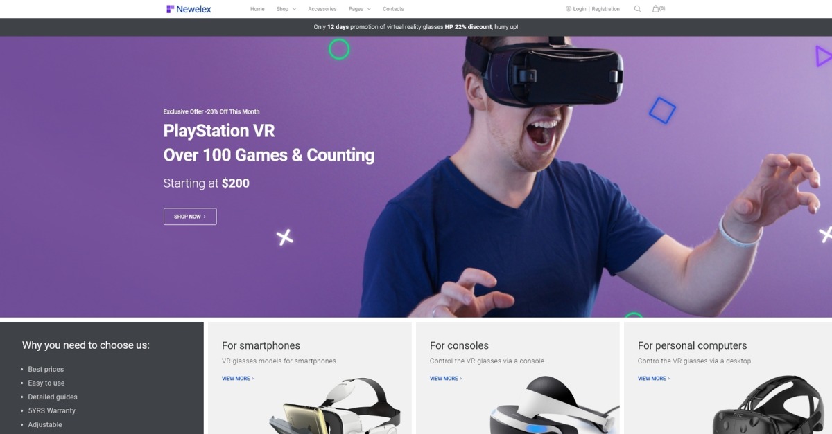 Привлеките больше людей в мир виртуальной реальности, используя тему Newelex! Представьте свой интернет-магазин, посвященный теме виртуальной реальности, самым интересным образом. Вы отобразите основные характеристики вашего магазина, распределите товары по категориям; предоставить подробную информацию о каждом продукте и многое другое с этой темой. Существуют заранее разработанные страницы, на которых вы сможете просто изменить контент, но также вы можете настроить веб-сайт в соответствии с вашими потребностями и целями, используя мощные функциональные возможности плагинов Jet для конструктора страниц Elementor. Вы создадите продвинутый веб-сайт электронной коммерции, используя плагины WooCommerce и JetWooBuilder. С плагином JetCompareWishlist вы легко и быстро добавите на свой сайт функции сравнения и списка желаний. Используя плагин JetProductGallery, вы в несколько кликов покажете изображения товаров в стильной и интуитивно понятной галерее. С плагином JetMenu можно легко создать привлекательное мегаменю с раскрывающимися разделами и оформить его по своему желанию. Плагин JetSmartFilters позволит добавлять фильтры AJAX на страницы без каких-либо знаний в области кодирования. Newelex — адаптивная тема, которая станет идеальным решением для увеличения продаж и привлечения потенциальных клиентов.