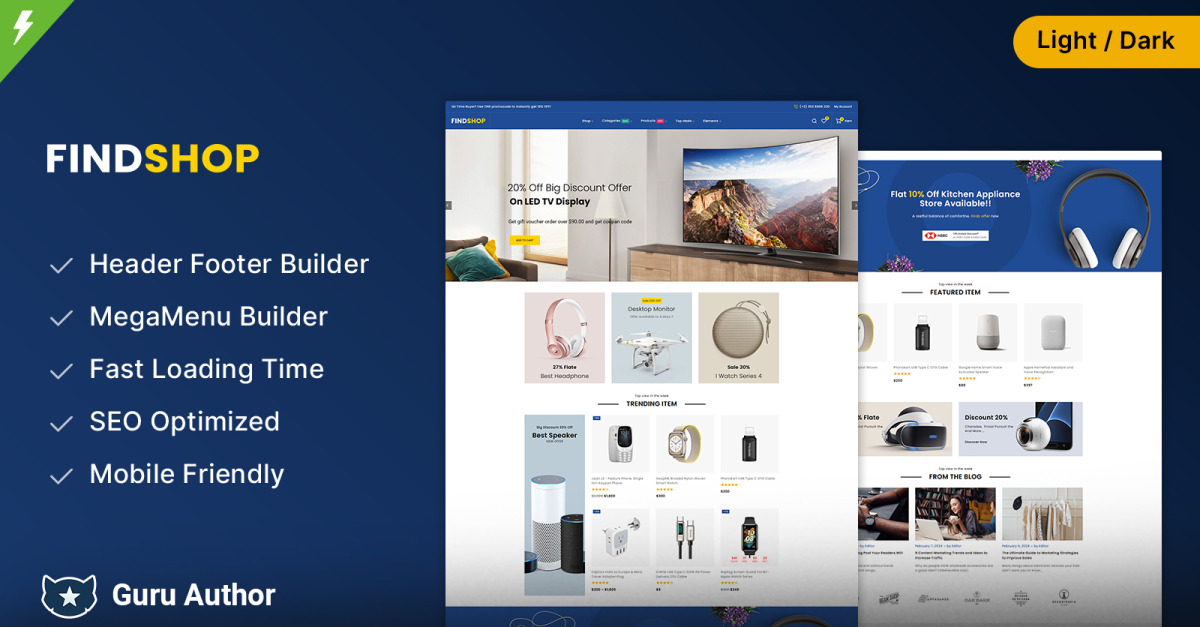 Findshop — это тема WooCommerce «все в одном», с множеством функций, разработанная для того, чтобы владельцы магазинов могли создать элегантный и высокопроизводительный интернет-магазин — независимо от ниши. Продаете ли вы электронику, моду, мебель или даже управляете многокатегорийным мегамагазином, Findshop предлагает современный, адаптивный и мощный опыт электронной коммерции, который поможет вам выделиться.