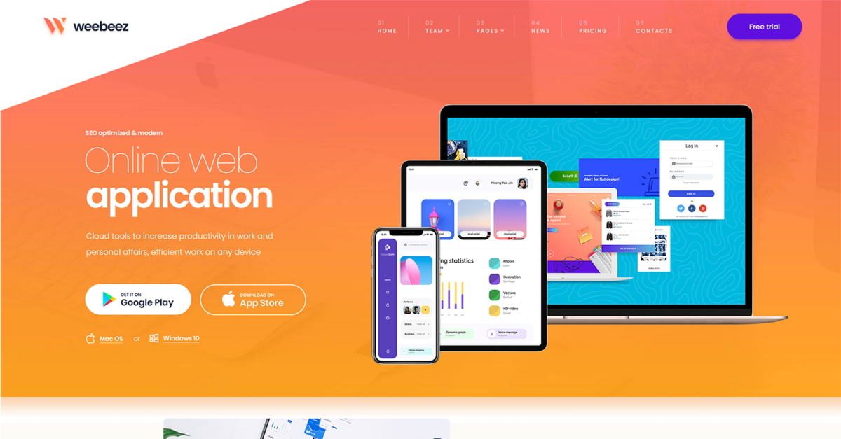 Weebeez — это современная и профессиональная тема WordPress для сервисов веб-приложений, проектов SAAS, компаний, занимающихся веб-разработкой или веб-дизайном. Тема имеет потрясающую анимацию, отличный интерактивный слайдер на главной странице, адаптивный макет и удобный интерфейс администратора.