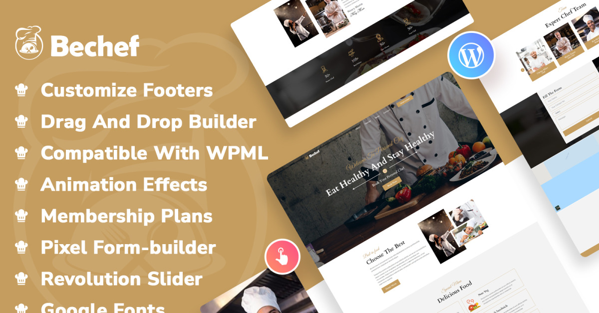 «Bechef — тема для блоггеров и шеф-поваров, специализирующихся на кулинарных рецептах» — это место, где можно представить свой бизнес по проверке шеф-поваров/поваров для тех, кто управляет отелем, кафе, облачной кухней или ищет штатных поваров. Его можно использовать для поиска персонала для управления вашим кафе, залом ожидания, столовой, облачной кухней или даже для дома. Эта тема также позволяет вам делиться своими рецептами или блогами, посвященными здоровью, чтобы привлечь аудиторию.
