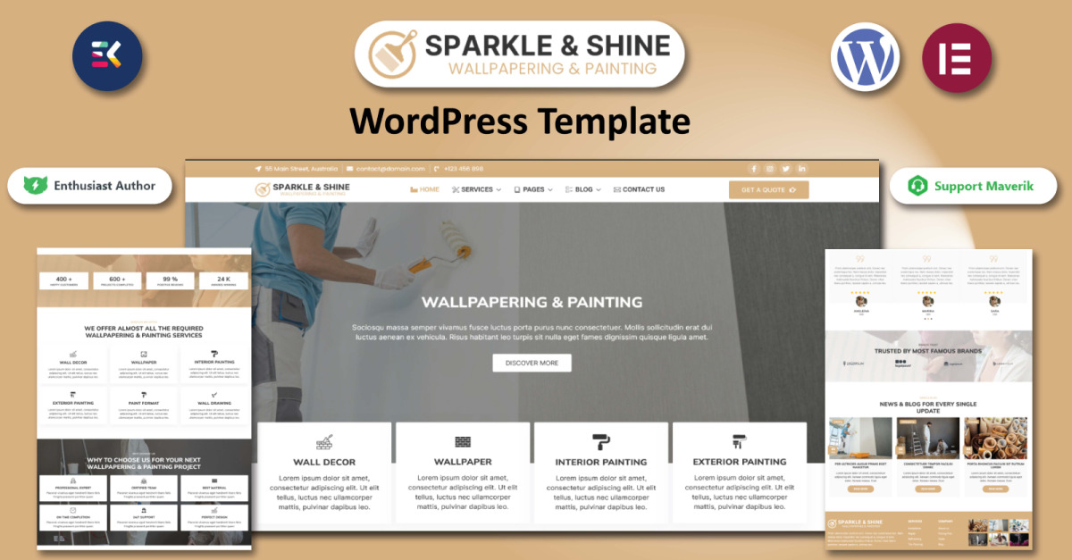 Sparkle & Shine — это современный и яркий шаблон WordPress Elementor , разработанный для монтажа обоев, услуг по покраске, декораторов интерьера и профессионалов по благоустройству дома. Этот шаблон с чистым макетом, потрясающими визуальными эффектами и плавной анимацией создан для того, чтобы помочь компаниям, работающим в сфере услуг, представить свое портфолио и превратить посетителей в клиентов.