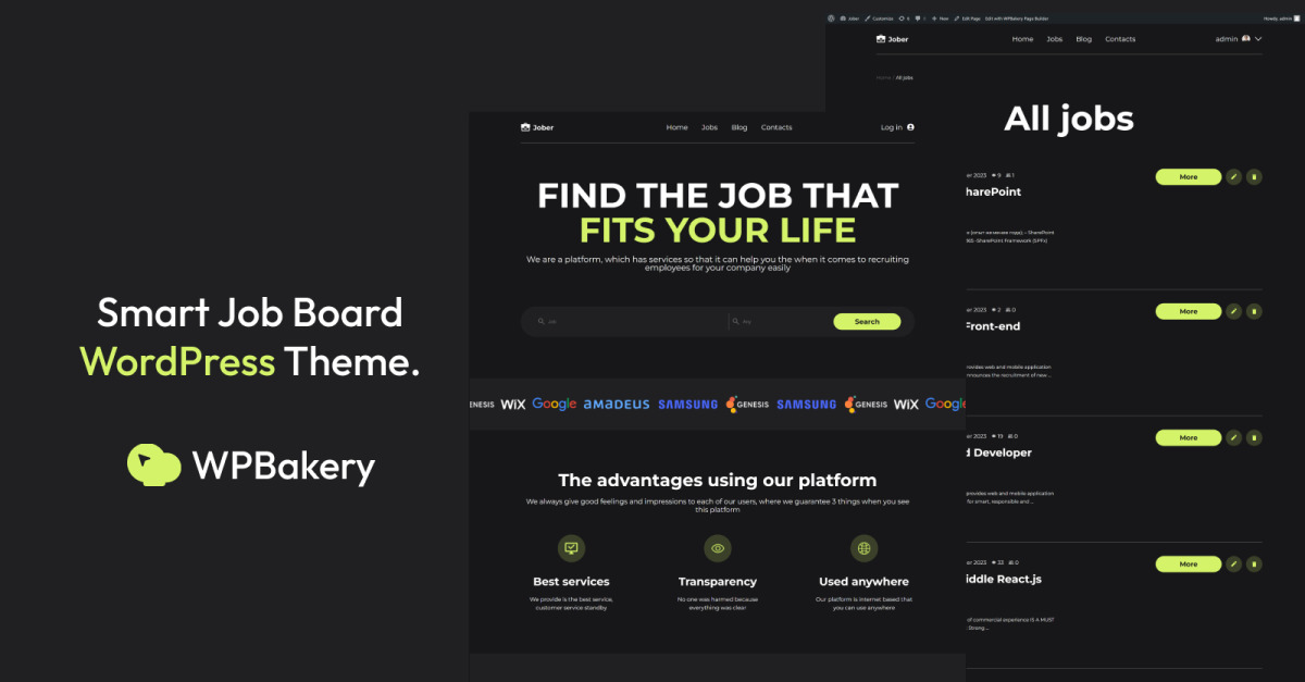 JOBER — тема WordPress для создания платформы поиска работы , любой желающий может зарегистрироваться и добавить свои вакансии. А соискатели присылают свои заявки и резюме. Имеется система быстрого поиска и фильтрации вакансий , работающая без перезагрузки. С помощью конструктора страниц вы можете изменить содержимое и положение разделов на главной странице. Кроме того, вы получите электронное письмо о новой вакансии или поправке к старой, сможете ее модерировать, а все работодатели получат уведомление о своих заявках.