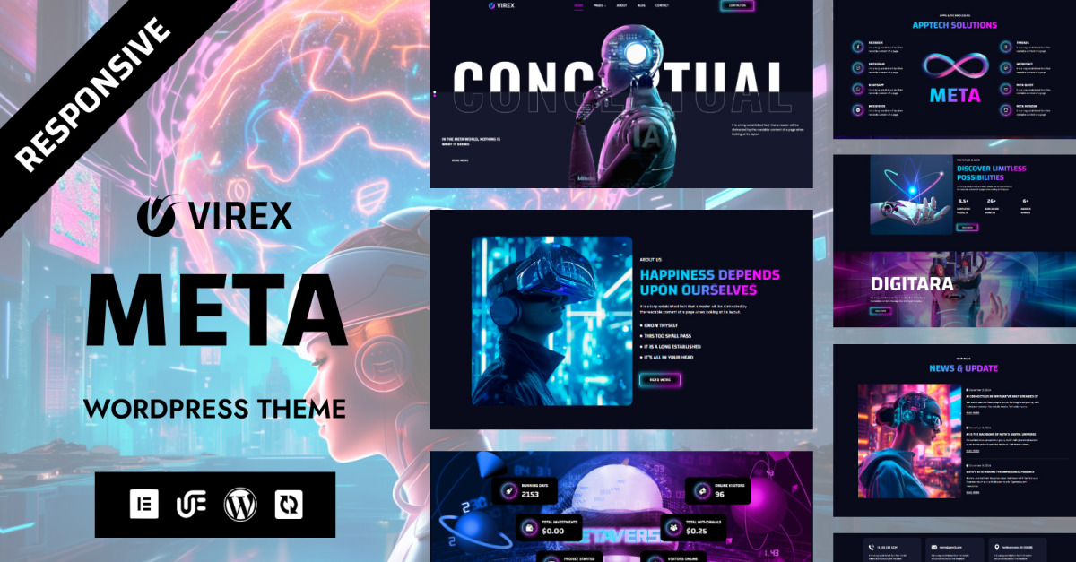Независимо от того, запускаете ли вы персональный блог, демонстрируете портфолио или управляете полноценным интернет-магазином, шаблон WordPress Virex обеспечивает непревзойденную гибкость, стиль и функциональность. Повысьте свое присутствие в Интернете с помощью Meta — шаблона, который так же уникален, как и ваше видение.