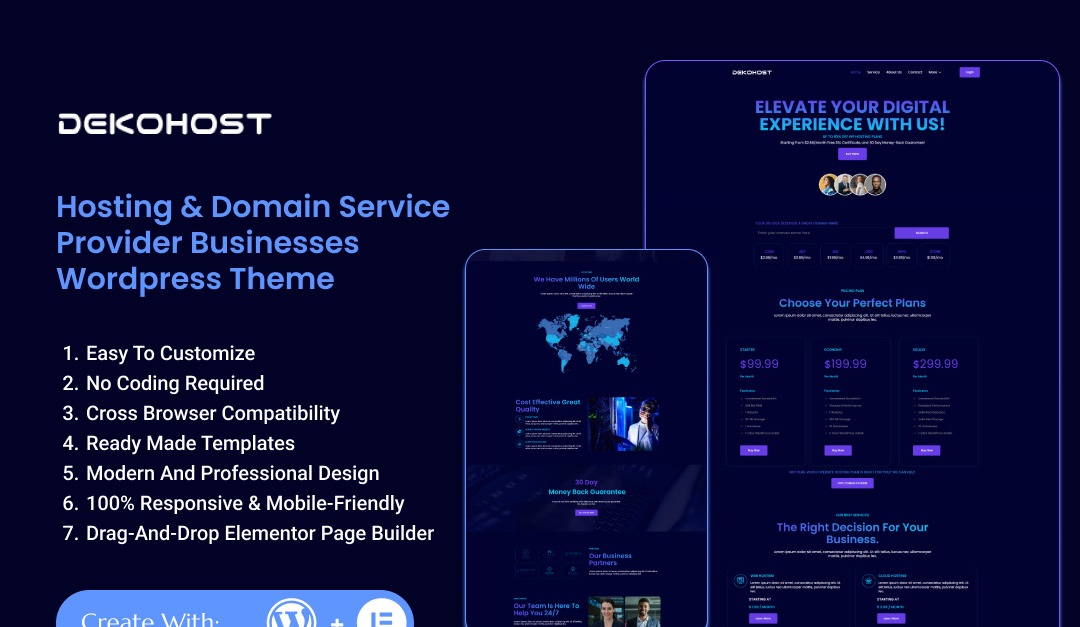 Dekohost — это чистая, современная и высокопрофессиональная тема WordPress, специально разработанная для провайдеров веб-хостинга, регистраторов доменов, технологических стартапов и предприятий облачных сервисов. Созданная с помощью мощного конструктора страниц Elementor, Dekohost предлагает полную гибкость и простоту использования — идеально подходит как для разработчиков, так и для не-кодеров.