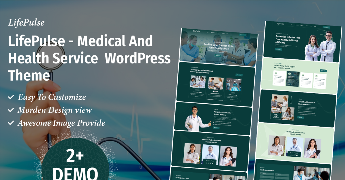 LifePulse — это современная, чистая и профессиональная тема WordPress, специально разработанная для медицинских центров, клиник, больниц, врачей, психологов и других учреждений здравоохранения. LifePulse уделяет особое внимание удобству использования и доступности, обеспечивая не только красоту, но и функциональность вашего сайта, а также его высокую конверсию.