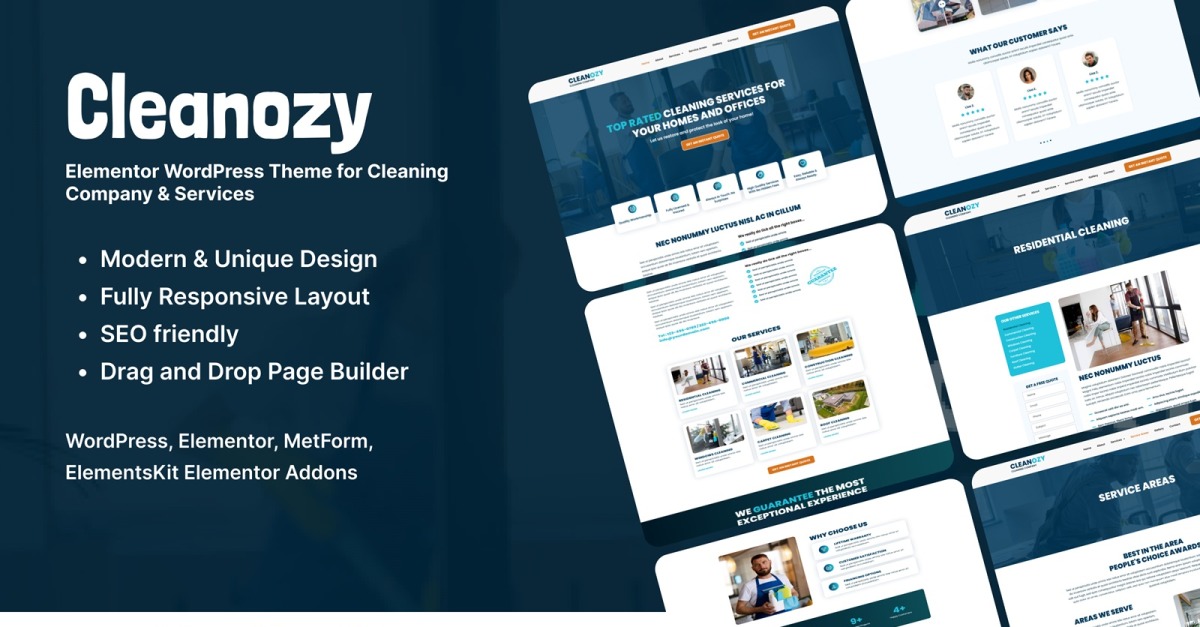 Cleanozy — современная тема WordPress, разработанная для клининговых компаний, служб по уборке и агентств по предоставлению услуг горничных. Разработанная с помощью конструктора страниц Elementor , она предоставляет вам полную творческую свободу для создания, редактирования и оформления сайта в режиме реального времени без необходимости писать код. От стильных страниц услуг до привлекательных контактных форм — всё создано для того, чтобы помочь вашему бизнесу привлечь больше онлайн-клиентов. Тема полностью адаптивна, оптимизирована для SEO и оснащена готовыми макетами, поэтому вы можете запустить профессиональный сайт всего за несколько кликов. Независимо от того, обслуживаете ли вы дома, офисы или промышленные помещения, Cleanozy обеспечит вам такое же яркое присутствие в интернете, как и сами помещения, которые вы убираете.