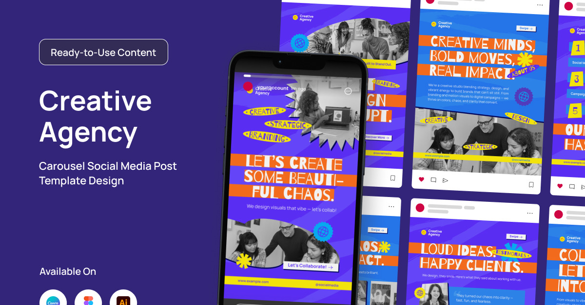 This carousel layout collection helps agencies and design studios communicate their vision through structured yet expressive slides. The combination of bold titles, balanced grids, and bright color accents creates a dynamic storytelling rhythm ideal for showcasing services, case studies, or creative insights.
