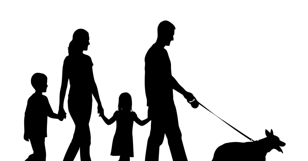 Familjens promenader hund silhuett svart skugga profil isolerad på vit bakgrund